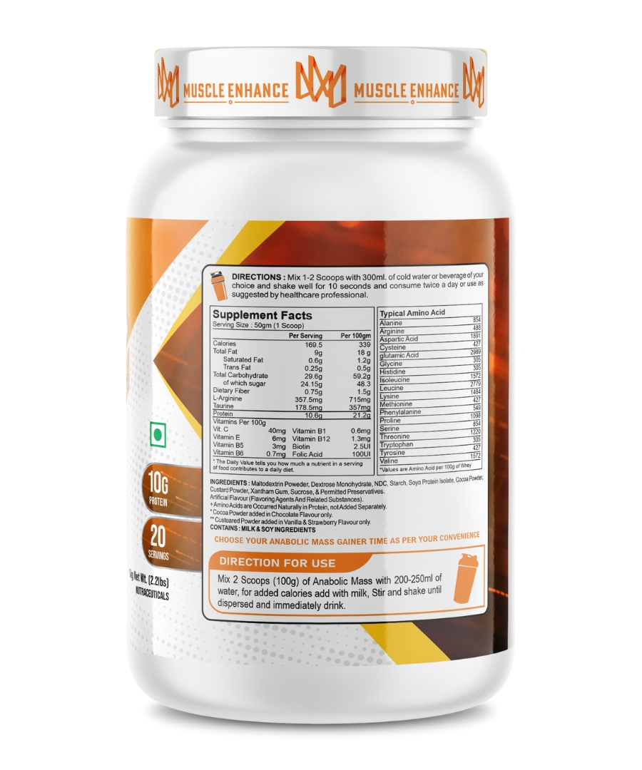 Muscle Enhance Nutrition Anabolic Mass is an advanced and effective weight gain supplement. It helps in the synthesis of new muscle gains and prevent post workout muscle loss. Added digestive enzymes helps in quick digestion of nutrients. Each serving provides 10 grams of protein and 169 calories.