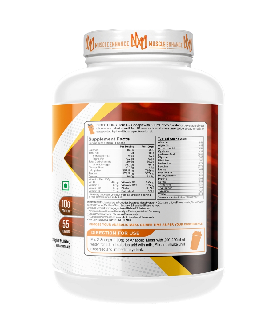 Muscle Enhance Nutrition Anabolic Mass is an advanced and effective weight gain supplement. It helps in the synthesis of new muscle gains and prevent post workout muscle loss. Added digestive enzymes helps in quick digestion of nutrients. Each serving provides 10 grams of protein and 169 calories.