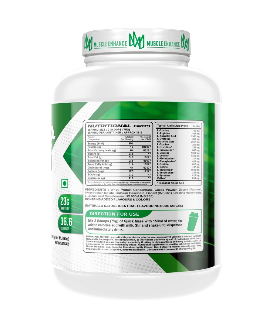 Muscle Enhance Nutrition Bulk Mass is an advanced and effective weight gain supplement. It helps in the synthesis of new muscle gains and prevent post workout muscle loss. Added digestive enzymes helps in quick digestion of nutrients. Each serving provides 23 grams of protein
