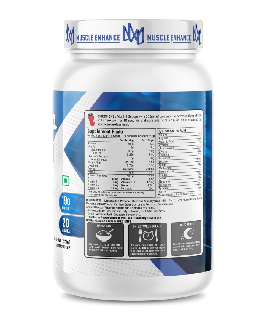Muscle Enhance Nutrition Lean Mass is an advanced and effective weight gain supplement. It helps in the synthesis of new muscle gains and prevent post workout muscle loss. Added digestive enzymes helps in quick digestion of nutrients. Each serving provides 19 grams of protein