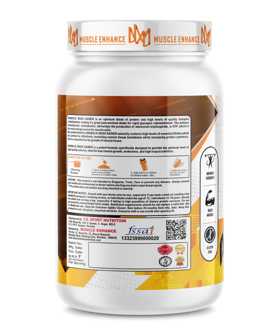 Muscle Enhance Nutrition Anabolic Mass is an advanced and effective weight gain supplement. It helps in the synthesis of new muscle gains and prevent post workout muscle loss. Added digestive enzymes helps in quick digestion of nutrients. Each serving provides 10 grams of protein and 169 calories.