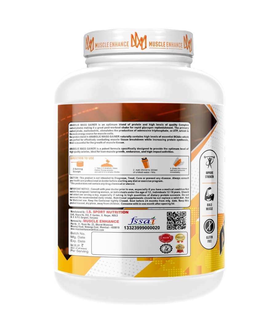 Muscle Enhance Nutrition Anabolic Mass is an advanced and effective weight gain supplement. It helps in the synthesis of new muscle gains and prevent post workout muscle loss. Added digestive enzymes helps in quick digestion of nutrients. Each serving provides 10 grams of protein and 169 calories.