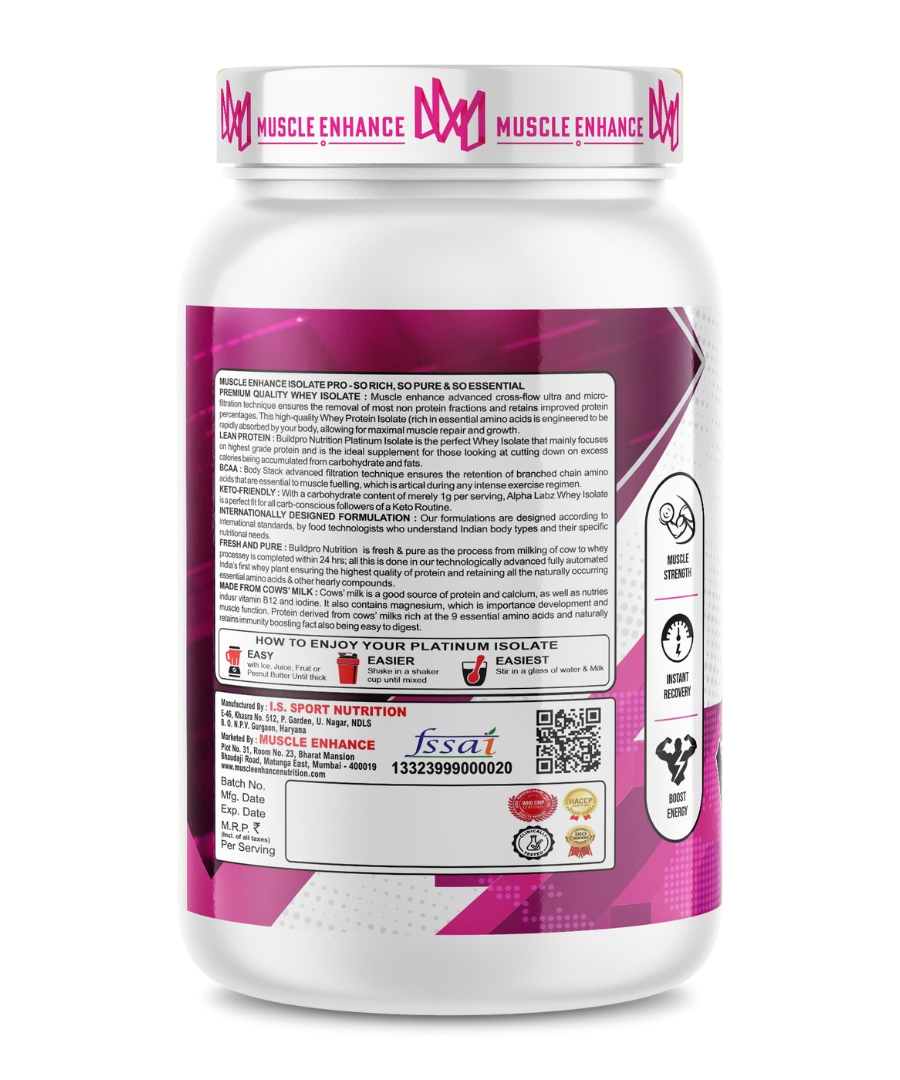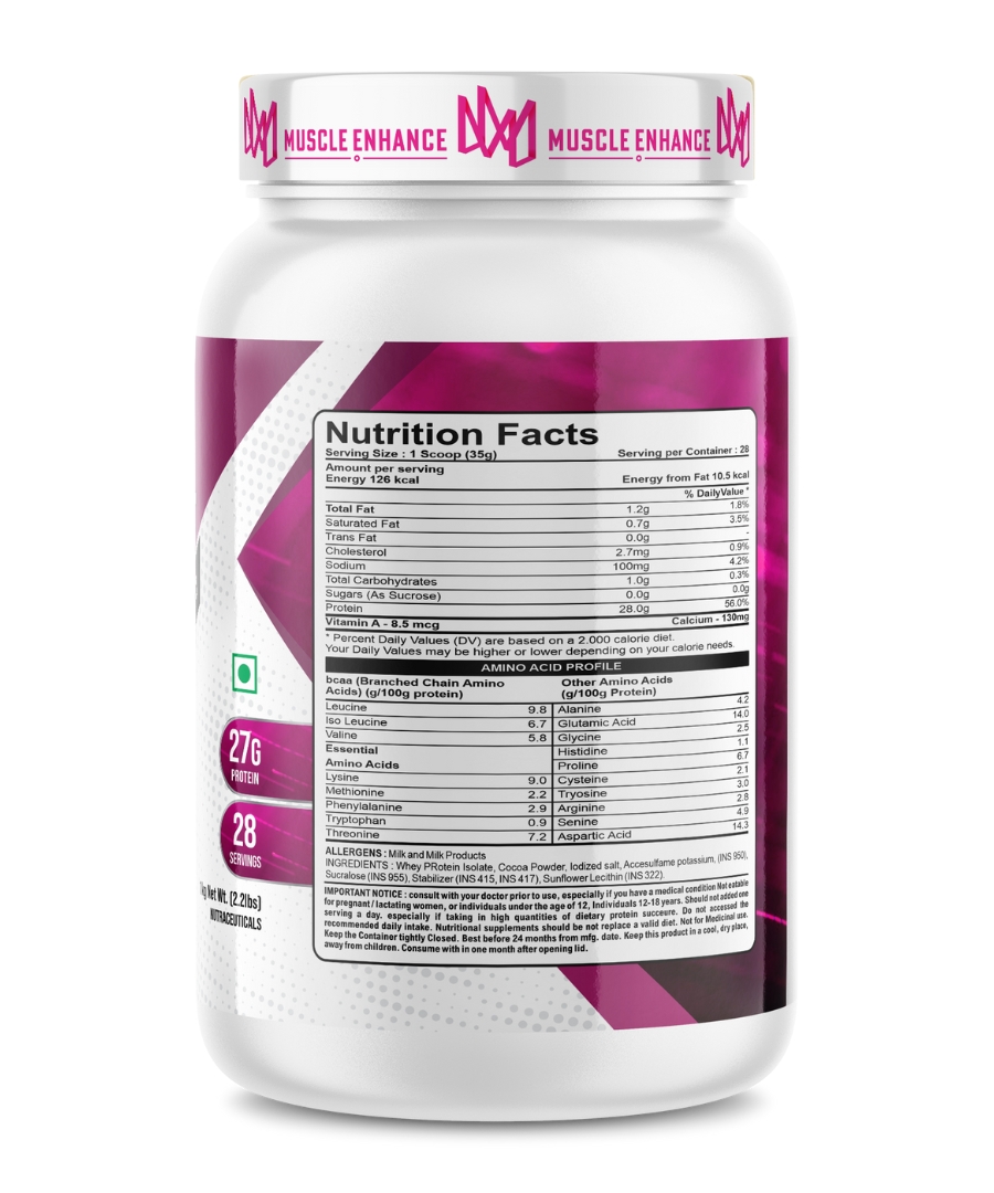 Muscle Enhance Nutrition Whey Protein kick starts your workout journey. Each serving offers 27 grams of premium protein's blend with simple carbs and digestive enzymes. It dosen't contain any added sugar or transfat. This beginner's formula is specially designed for lean muscle gain, muscle recovery and to maintain strength and energy level.