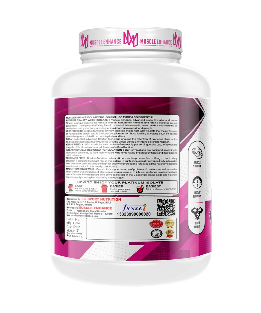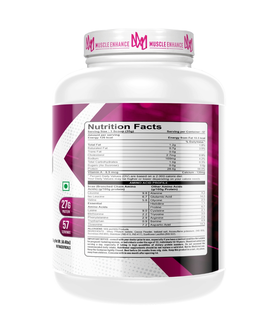 Muscle Enhance Nutrition Whey Protein kick starts your workout journey. Each serving offers 27 grams of premium protein's blend with simple carbs and digestive enzymes. It dosen't contain any added sugar or transfat. This beginner's formula is specially designed for lean muscle gain, muscle recovery and to maintain strength and energy level.