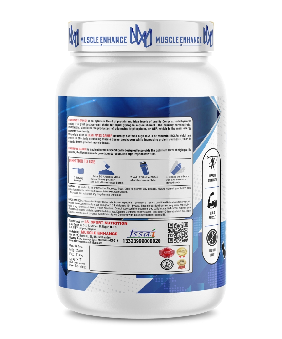 Muscle Enhance Nutrition Lean Mass is an advanced and effective weight gain supplement. It helps in the synthesis of new muscle gains and prevent post workout muscle loss. Added digestive enzymes helps in quick digestion of nutrients. Each serving provides 19 grams of protein